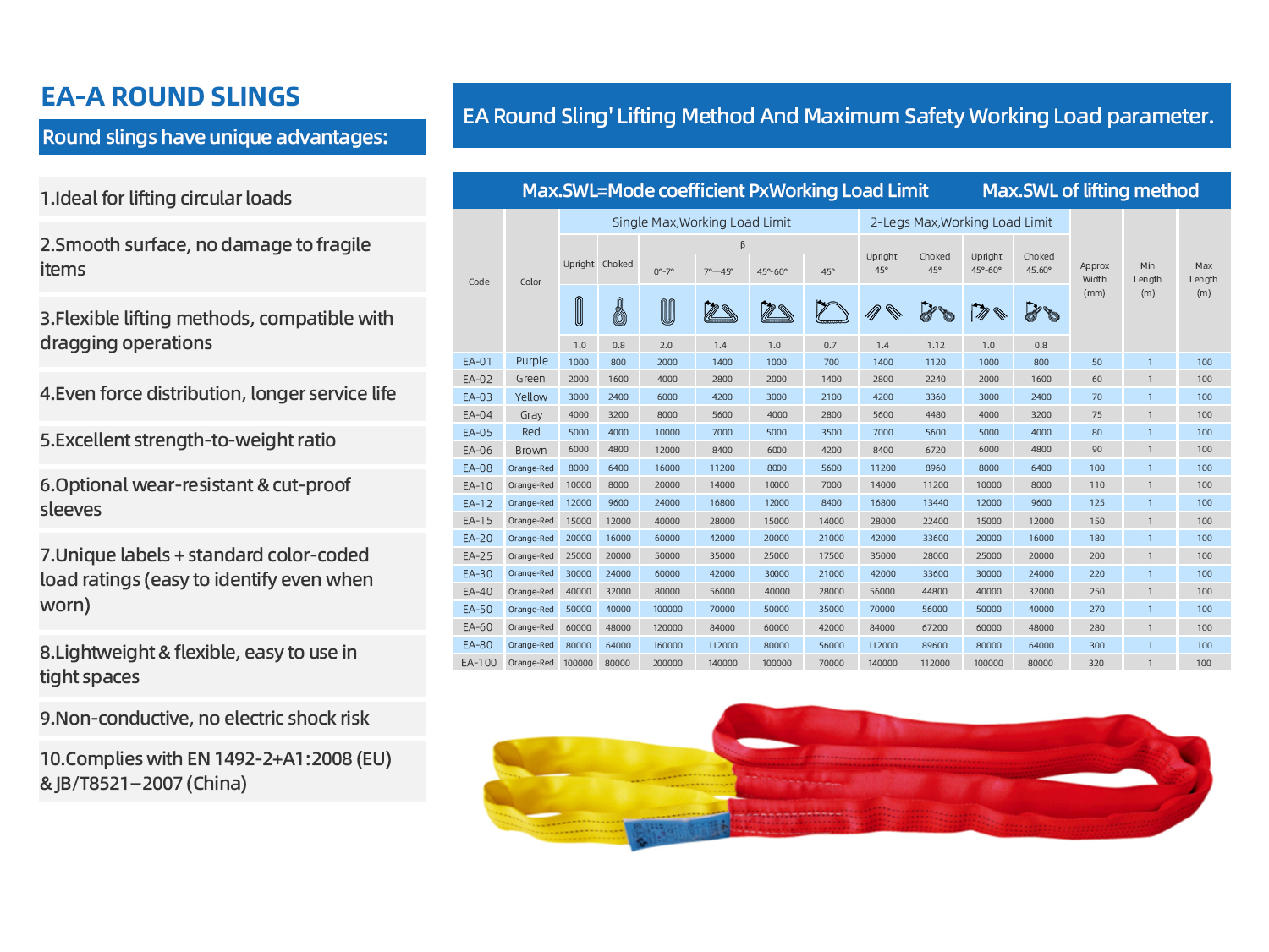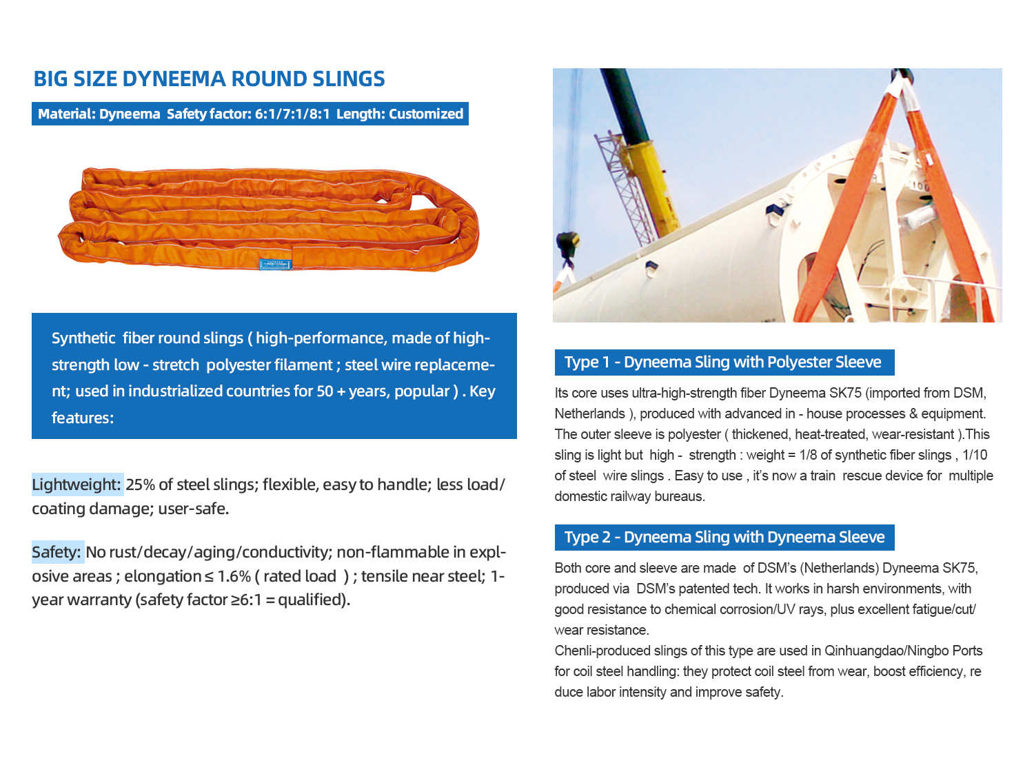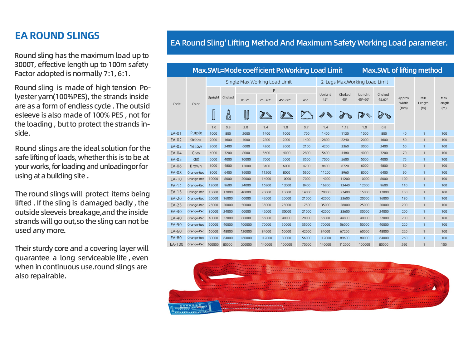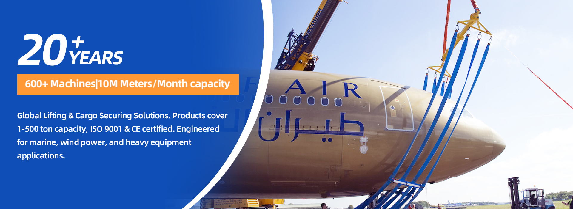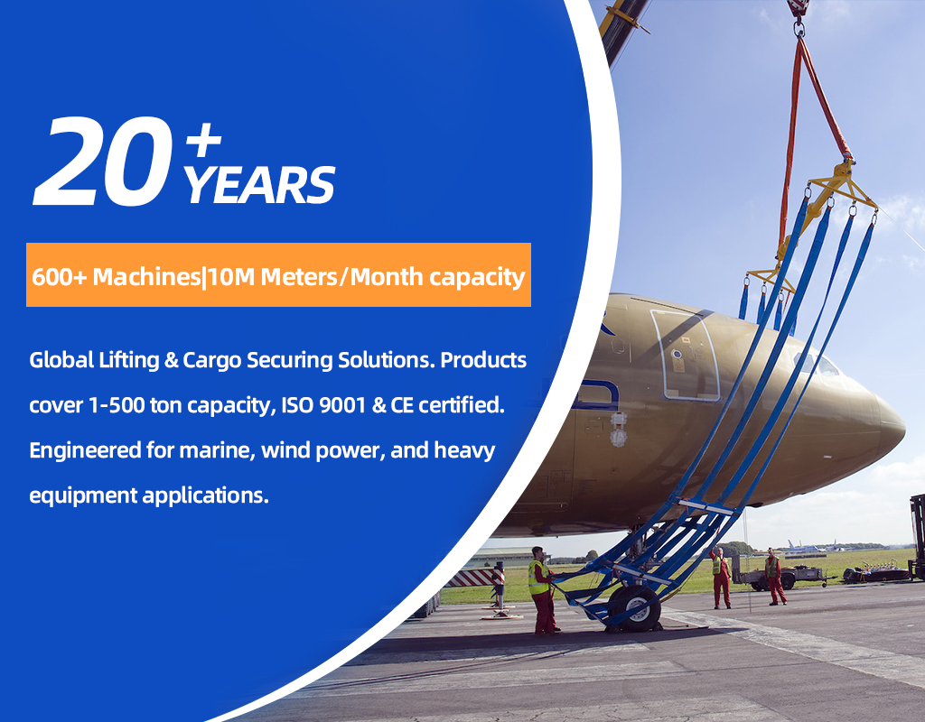 Through years of development, we have established an integrated supply chain—from raw materials to testing equipment—to ensure the quality of heavy‑capacity slings. Our product range includes round slings from 20 to 3,000 tons and flat slings from 20 to 50 tons.